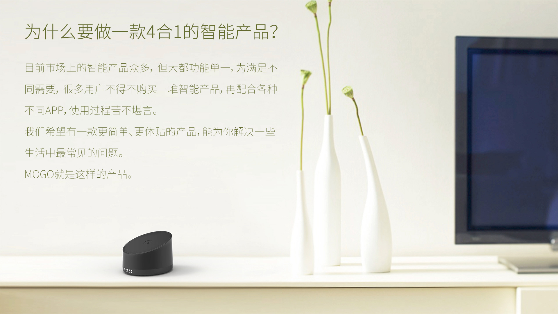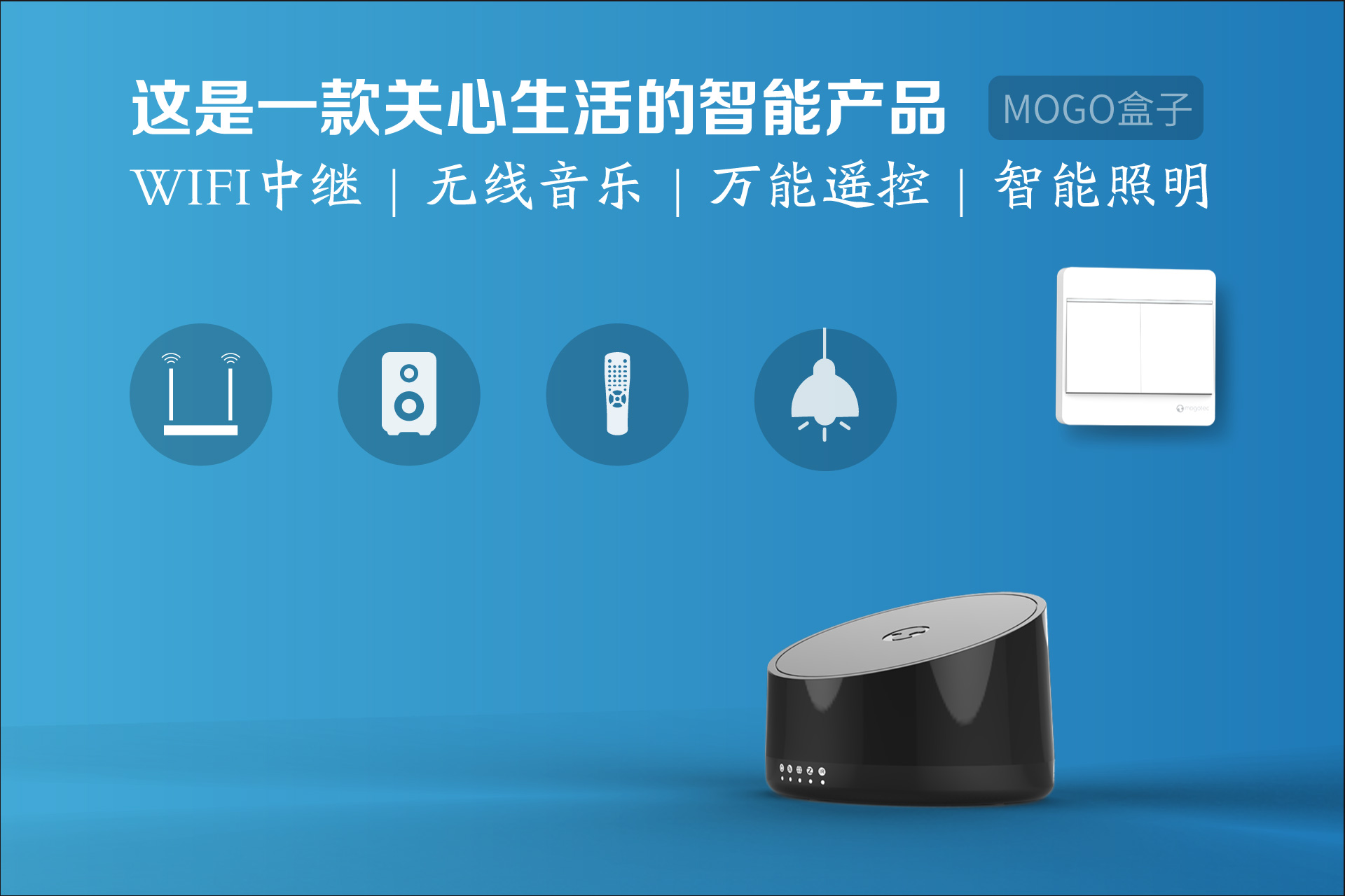 MOGO盒子是一款关心生活的智能产品,它集WIFI中继、无线音乐、超级遥控、照明控制于一身,能为你解决生活中最常见的问题。